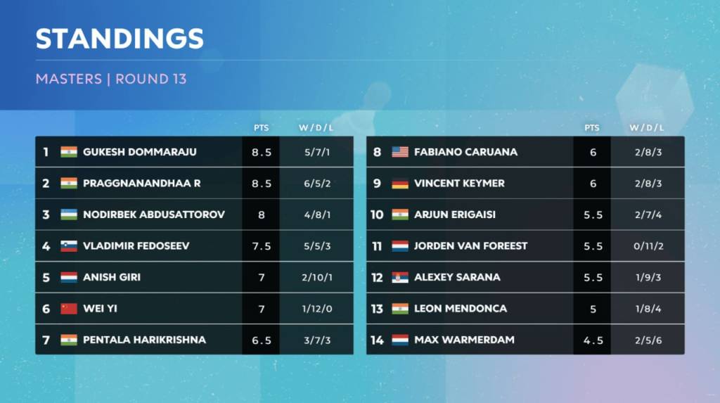 “Masters” guruhida g‘oliblikka asosiy da’vogar Gukesh Dommaraju 13-turda oq donalarda harakatlanishiga qaramasdan Arjun Erigaisiga yutqazib qo‘ydi. Xuddi shuningdek, hamyurti Rameshbabu Praggnanandxa qora donalarda Vinsent Keymerga qarshilik ko‘rsatdi. 7 soatga yaqin vaqt davom etgan bahsda germaniyalik shaxmatchi Praggnanandxani 80-yurish holatida taslim etdi.