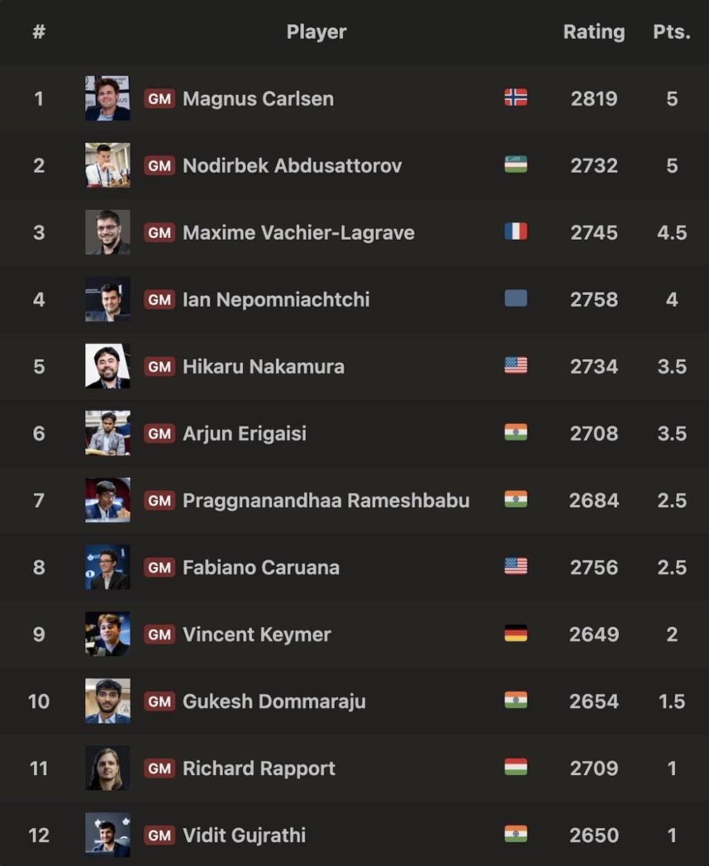 Turnir boshlanishiga ikki kun qolganda amerikalik Hans Niyemanning o‘rniga imtiyozli yo‘llanma sohibi sifatida musobaqaga taklif etilgan hamyurtimiz Nodirbek Abdusattorov 1-turda germaniyalik Vinsent Keymerni, 2-turda amerikalik Fabiano Karuanani, 3-turda vengriyalik Richard Rapportni taslim etdi. 4 va 5-turlarda fransiyalik Maksim Vashe-Lagrev va FIDE bayrog‘i ostida turnirda qatnashayotgan Yan Nepomnyashiy bilan murosa yo‘lini tanladi. 6-turda esa hindistonlik Vidit Gujratni dog‘da qoldirgan Nodirbek 5 ochko bilan peshqadamlar qatoridan joy olishga muvaffaq bo‘ldi.
